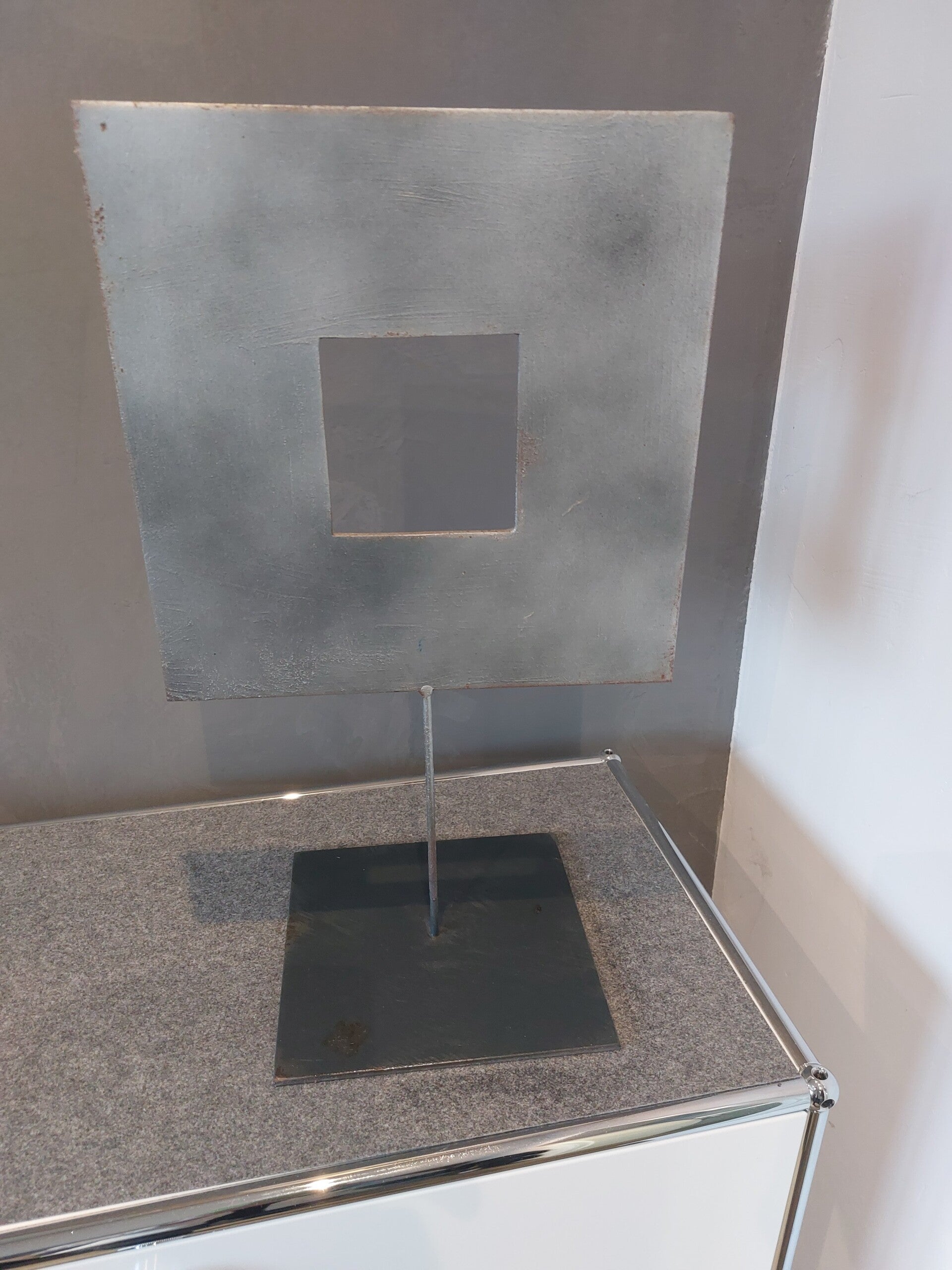 Diese einzigartige metallische Skulptur verkörpert zeitlose Eleganz und minimalistische Kunst. Mit ihrem schwebenden Design und subtilen Gebrauchsspuren erzählt sie eine Geschichte von Beständigkeit und Stil. Perfekt als Blickfang,